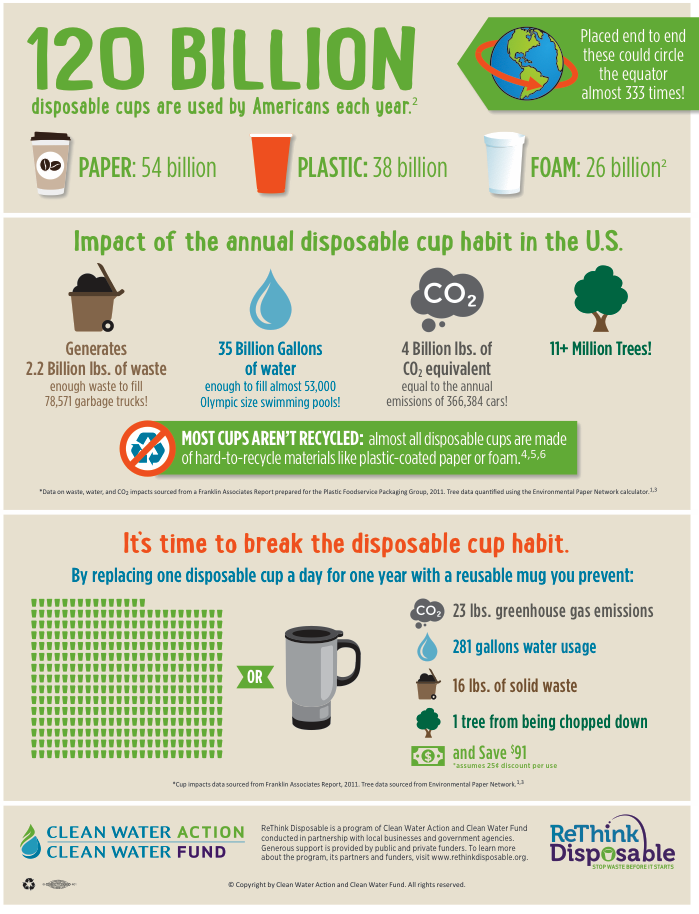 I spent two months looking into disposables at the university. Contrary to popular belief, disposables aren't all that bad. The carbon footprint of a disposable may actually be lower than a reusable product.