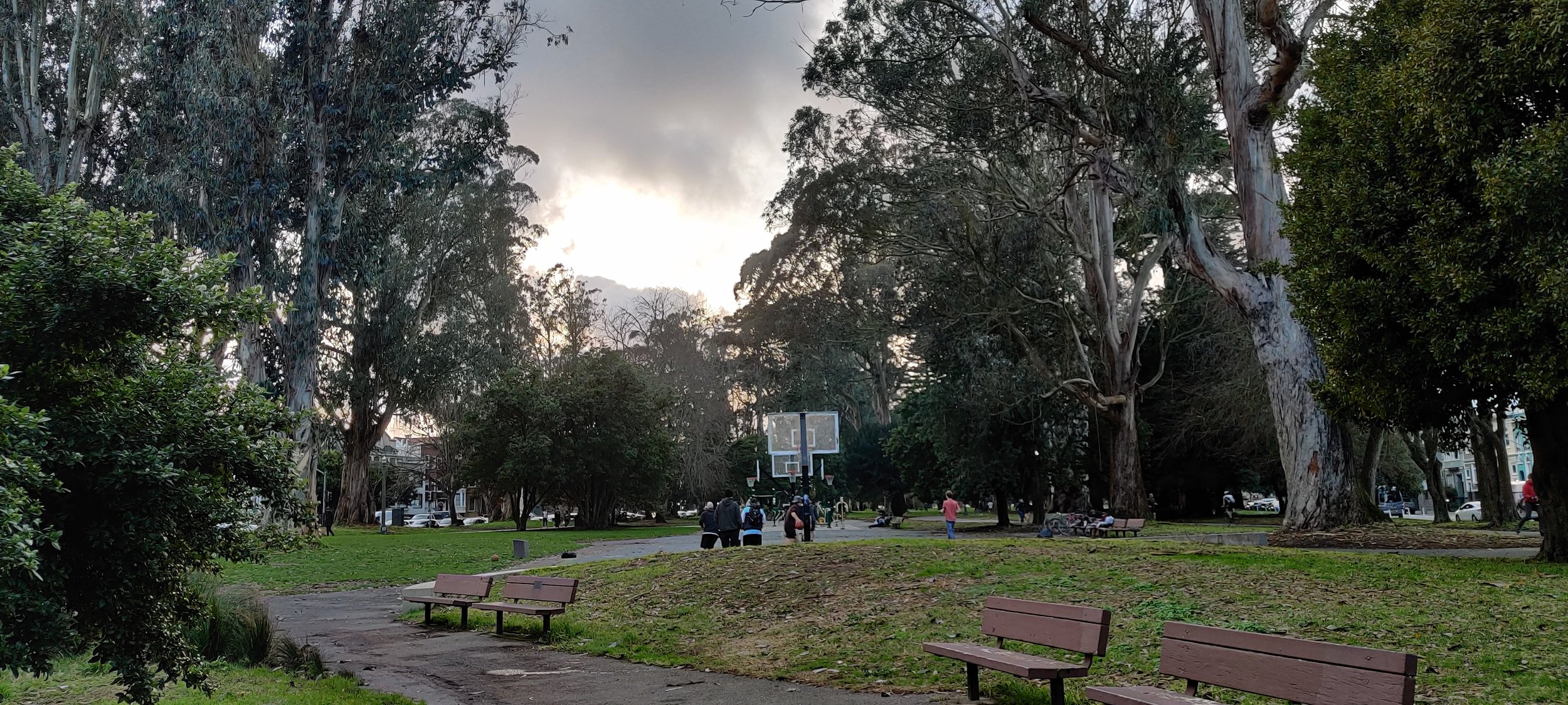 Afterward, I walked towards the Panhandle for my last viewing. I think they call it the Panhandle because it’s a narrow park linked to Golden Gate Park, which would be the pan? I’d actually been here on Sunday when I was looking for a place to have breakfast, but the sun was shining today and people were out walking their dogs, playing basketball and running around the park.